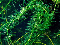 Brazilian Elodea stems have numerous branches and can grow over 20 ft. in length. Is often confused with hydrilla and native elodea. Lance-shaped leaves are about 1/8 inches wide and 1.5 inches long and often have very minute teeth along the edges that may require magnification to see. Leaves are arranged in whorls around the stem with each whorl composed of 4 to 6 leaves. The number of leaves per whorls doubles or triples every 8 to 12 nodes. These “double nodes” are the only place where branches occur along the stem.