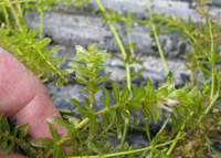 Brittle Naiad leaves are opposite (in pairs along the stem), but sometimes appear to be in a whorl at the tip. Leaves are 1-2 inches long, toothed, stiff and pointed. Plant is very brittle and easily breaks into pieces.
