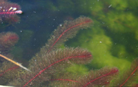 Parrot Feather woody stems can grow over 5 feet in length, often extending outward onto the bank or shore. Emergent leaves are bright blue-green, rigid and deeply serrated. Leaves are arranged in whorls of 4-6 around the stem, with each leaf containing 10-18 segments. The leaves can extend 12″ out of the water and look like miniature fir trees. The underwater leaves are red-brown in color and have 20-30 segments per leaf. They appear to be decaying and are often confused with Eurasian watermilfoil leaves.